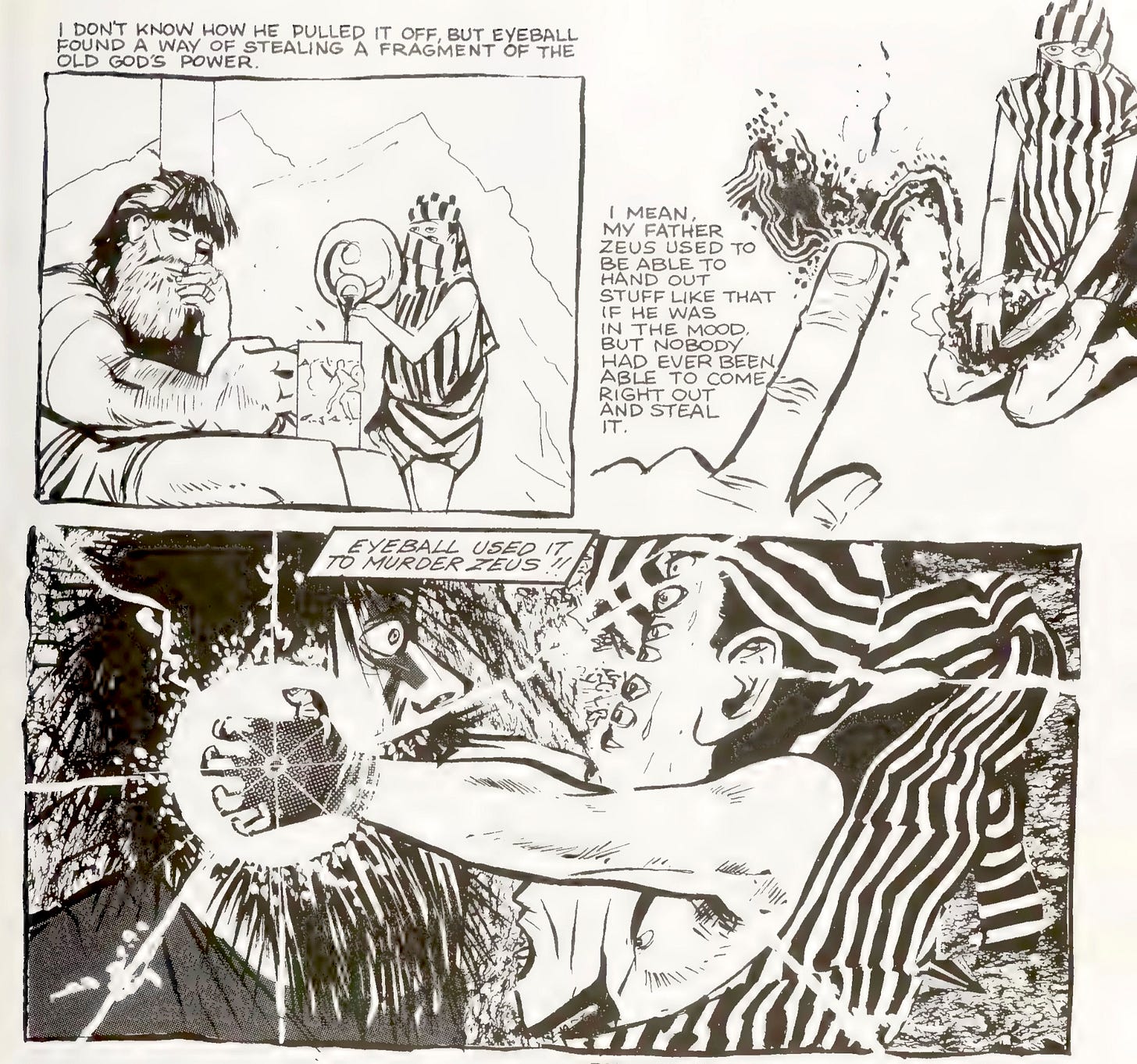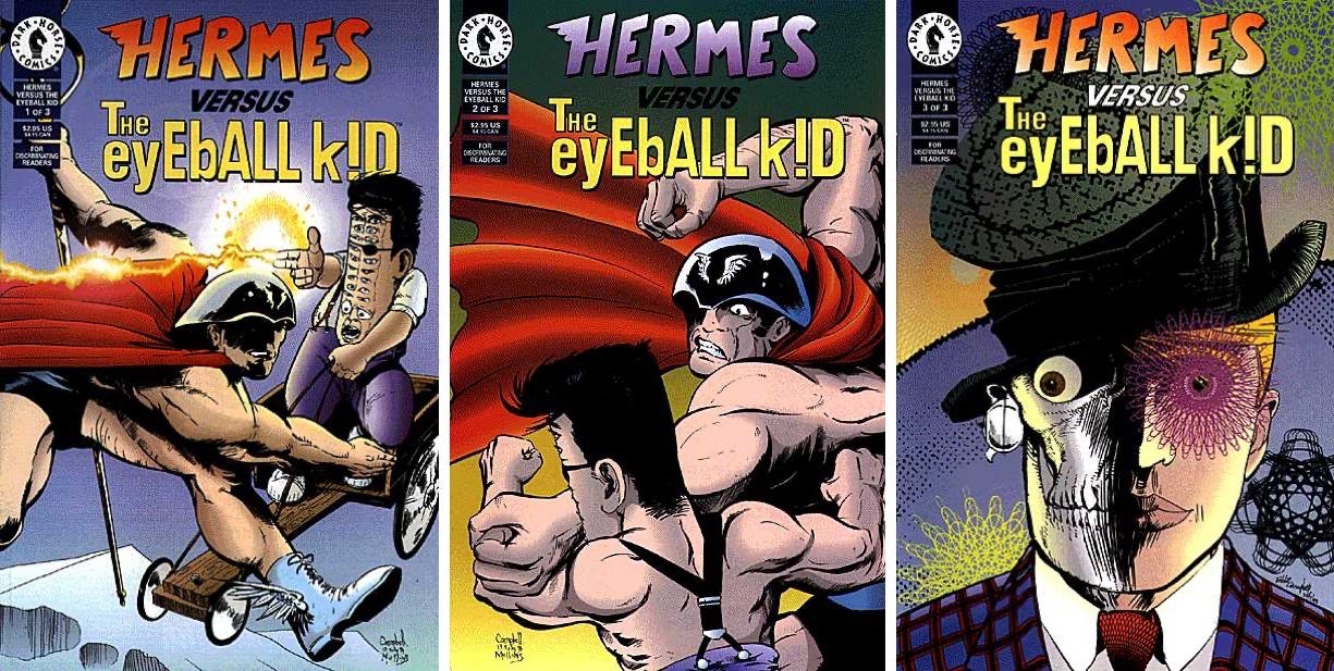 This Eyeball Kid, the comics one with a bunch of eyeballs, came with quite a backstory—that myth Campbell said he had to create to explain him. Turns out he was the grandson of Argus, a figure in Greek mythology with a hundred eyes, who was murdered by Hermes. Eyeball, as he was known, in Campbell’s myth ended up murdering Zeus.